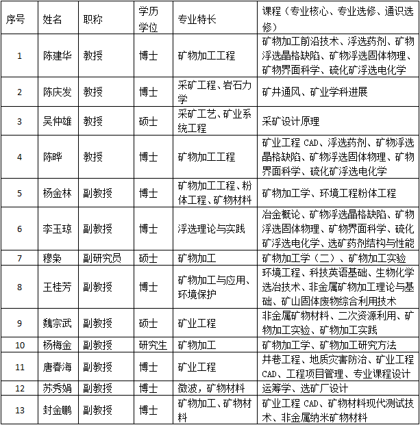 本专业紧密结合有色金属产业,培养以有色金属采矿、选矿为主的矿产资源开发利用与加工高素质专业技术人才。以矿业行业,特别是有色金属矿业对矿业人才的知识结构、能力结构和素质要求的特点,构建既能体现矿物资源工程专业平台的要求,又能适应学生向资源开采与安全、资源加工与循环利用两个专业方向发展的课程体系和相应的教学计划。学科基础课涉及数学、物理、化学、工程力学、工程流体力学、电工电子学、机械设计、工程制图等;专业课程融合了采矿工程和矿物加工工程两专业知识,使学生具有更宽的专业知识面。在专业平台上,采选并重;在专业方向上,设立资源开采与安全、资源加工与循环利用两个专业方向,强化专业深度、前沿技术;加强实践环节、科研能力和创新能力培养;加强现代科技和素质课程教育,提高人才对未来社会和行业发展的适应性。