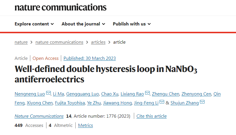 近日,《自然》(Nature) 子刊《自然▪通讯》(《Nature Communications》)以“具有典型双电滞回线的NaNbO3反铁电体”( “Well-defined double hysteresis loop in NaNbO3 antiferroelectrics” )为题,报道了太阳集团2138罗能能教授团队关于NaNbO3反铁电体的最新研究进展。罗能能教授为第一和通讯作者,太阳集团2138为第一单位。澳大利亚伍伦贡大学、清华大学、北京理工大学、香港理工大学为该工作的重要合作单位。这也是该团队近年来在《Nature Communications》发表的第2篇关于反铁电材料的学术论文。