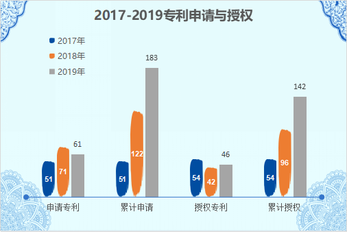 2017年,申请专利51项,获授权专利54项;2018年,申请专利71项,获授权专利42项;2019年,申请专利61项,获授权专利46项。