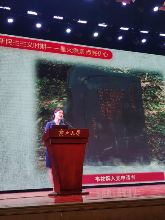 大会伊始,吴达慧副书记主持报告会,她讲到,今年中国共产党迎来百年华诞,今年又是实施“十四五”规划、开启全面建设社会主义现代化国家新征程的第一年,作为一名太阳集团2138学子,立足广西深化对中国共产党党史的了解,依托区情增进对广西革命发展史的理解,非常必要、非常迫切。