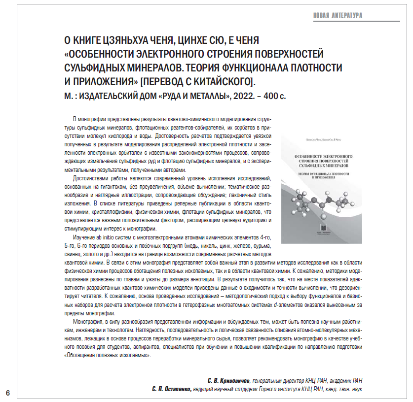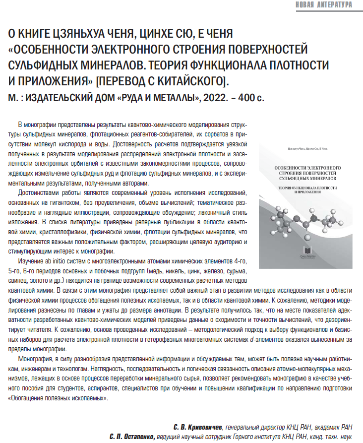 陈建华教授2020年出版的专著——《硫化矿物电子结构与表面:密度泛函理论及在浮选中的应用(英文版)》是“十三五”国家重点出版物出版规划项目,于2020在爱思维尔同步出版并荣获“第二十届输出版优秀图书奖”,2022年版权输出俄罗斯。近日,俄罗斯科学院院士S. V. Krivovichev在俄罗斯矿业专业期刊《有色金属》和《矿山》上公开评价并推荐了本书:“该专著对矿物原料加工过程基础的原子和分子机制的描述十分形象,且逻辑严谨连贯,可以推荐该专著作为‘矿物加工’领域大学生、硕士研究生、博士研究生培训进修时的教学参考书。”S. V. Krivovichev院士还对该书对矿物加工领域的贡献给予了高度评价:“代表了矿物加工物理化学领域和量子化学领域研究方法发展的一个重要阶段。”