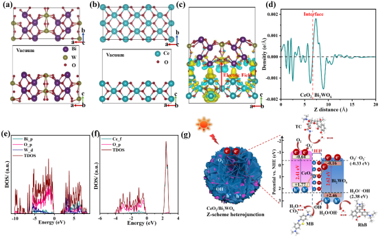 构建异质结光催化剂是提高废水处理光催化性能的良好途径。本研究采用原位液相法合成了一种新型的CeO2/Bi2WO6异质结,最佳配比为15% CeO2/Bi2WO6 (CBW-15)的光催化活性最高,对四环素(TC)的降解效率为99.21%,对罗丹明B (RhB)的降解效率为98.43%,对亚甲基蓝(MB)的降解效率为94.03%。5次循环后,TC去除率仍保持在95.38%。通过活性物质捕获实验发现,•O2-、h+和•OH分别是TC、RhB和MB的主要活性物质。采用液相色谱-质谱联用技术分析了TC可能的降解途径。通过实验和密度泛函理论(DFT)计算,提出了光致电荷转移和可能的降解机制。毒性评价实验表明,在TC降解过程中毒性显著降低。本研究揭示了CeO2/Bi2WO6光催化降解的机理,为毒性评价提供了新的见解。