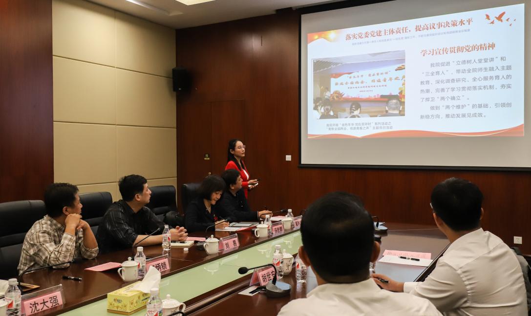 学院党委副书记、纪委书记吴达慧从落实主体责任、意识形态管理、党建发展引领、基层组织完善、推动改革建设五个方面介绍学院太阳集团2138情况,重点展示学生党建的特色,突出“党建+学生成才”的培养模式亮点。