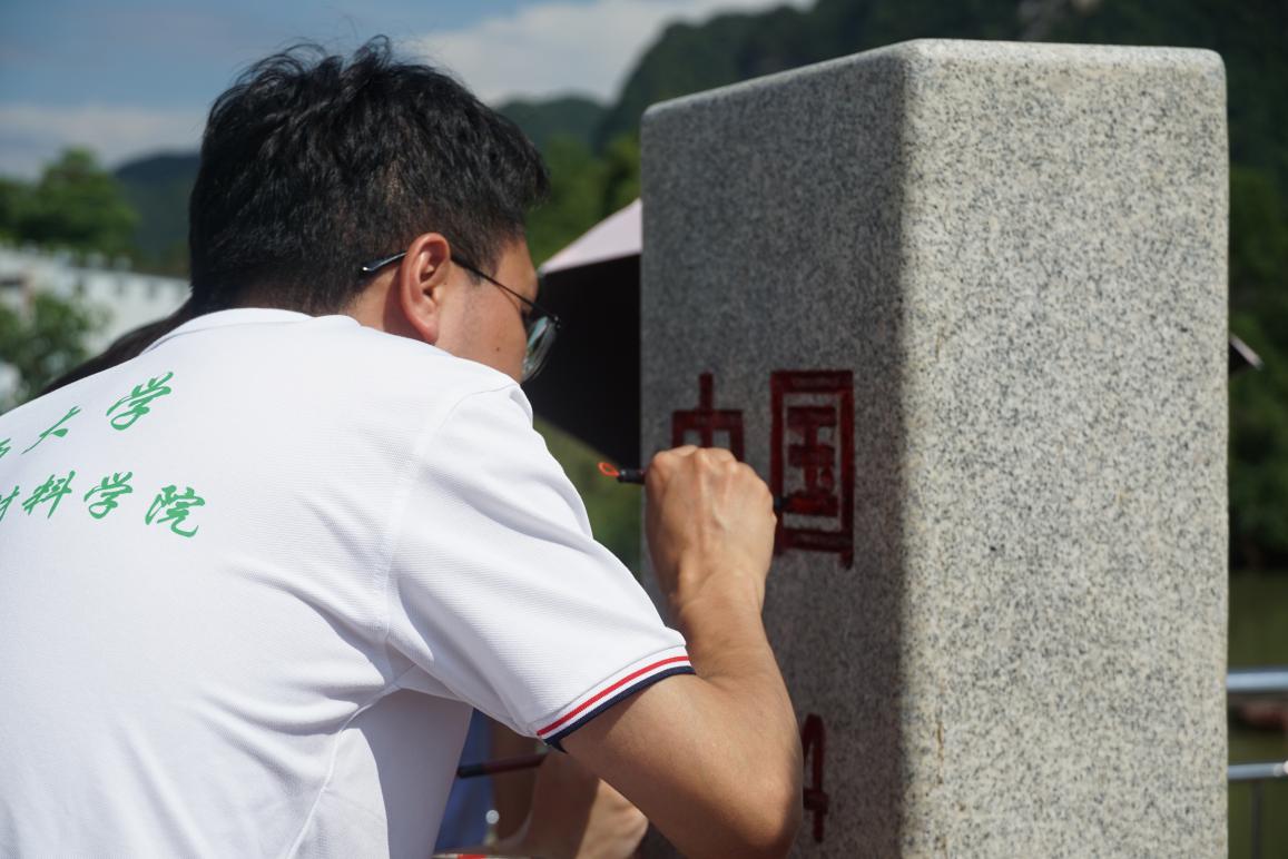 在边境派出所民警的亲切引领下,实践团缓缓步至庄严的944号和836号界碑前。心中满溢着敬畏之情,队员们仔细地清除界碑旁的杂草枯叶细致入微地擦拭着界碑的每一寸,随后以虔诚之心为其描红,以此举向伟大的祖国致以最深的敬意与颂扬。