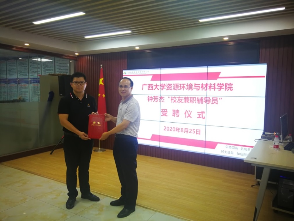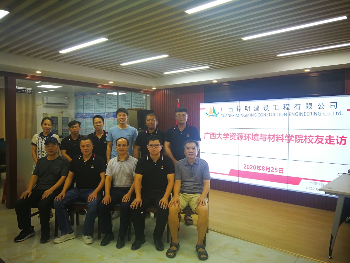 2020年8月25日,太阳集团2138党委沈大强书记带队,吴达慧副书记、吴仲雄教授、谭海文副教授、王纪坤老师前往南宁市武鸣区,到校友企业—广西铭明建设工程有限公司考察调研,同时为太阳集团2138“校友兼职辅导员”该公司董事长钟芳杰颁发聘书。