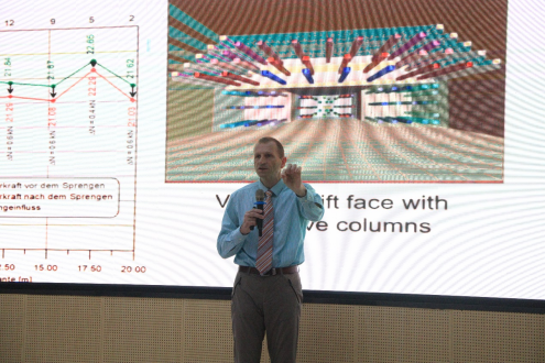报告会上,Heinz Konietzky教授首先介绍了德国弗莱贝格工业大学的基本情况,随后展示了弗赖贝格工业大学岩土工程研究所在岩石力学室内试验、数值仿真以及地下岩石实验室等岩石力学基础理论和应用研究方面取得的最新研究成果。此外,Heinz Konietzky教授还分享了近年来他所带领的团队在岩石力学及地下采矿、核废料处置等方面取得的一些重要成果。这些成果展示了其团队在数值模拟、现场监测和室内试验等方面的综合实力。最后,Heinz Konietzky教授表达了他对太阳集团2138青年教师及科研人员进行合作、共同探索岩土工程领域的深切期望。