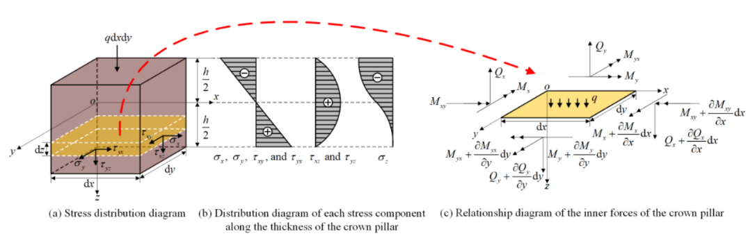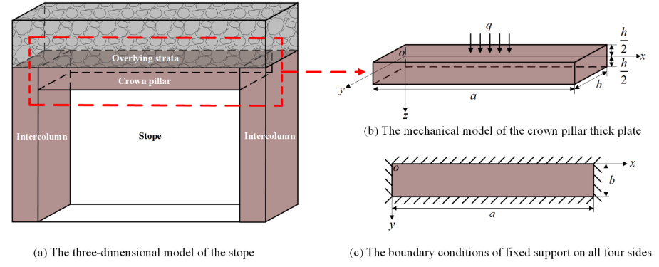 论文“The Reissner–Ritz Method for Solving the Deflection Function of the Crown Pillar in the Stope and Its Application in the Crown Pillar Failure Analysis”的第一作者为2021级硕士研究生郭翔咏,通讯作者为陈庆发教授。临时顶柱安全厚度确定的关键在于求解顶柱的挠度函数。前人在利用Reissner厚板理论计算顶柱安全厚度时多采用伽辽金法,但该法难以求解复杂边界条件下顶柱的挠度函数。研究团队提出了适于求解复杂边界条件下的顶柱挠度函数的Reissner-Ritz法;结合矿岩赋存条件及其物理力学参数,求解得到具体的临时顶柱安全厚度参数。