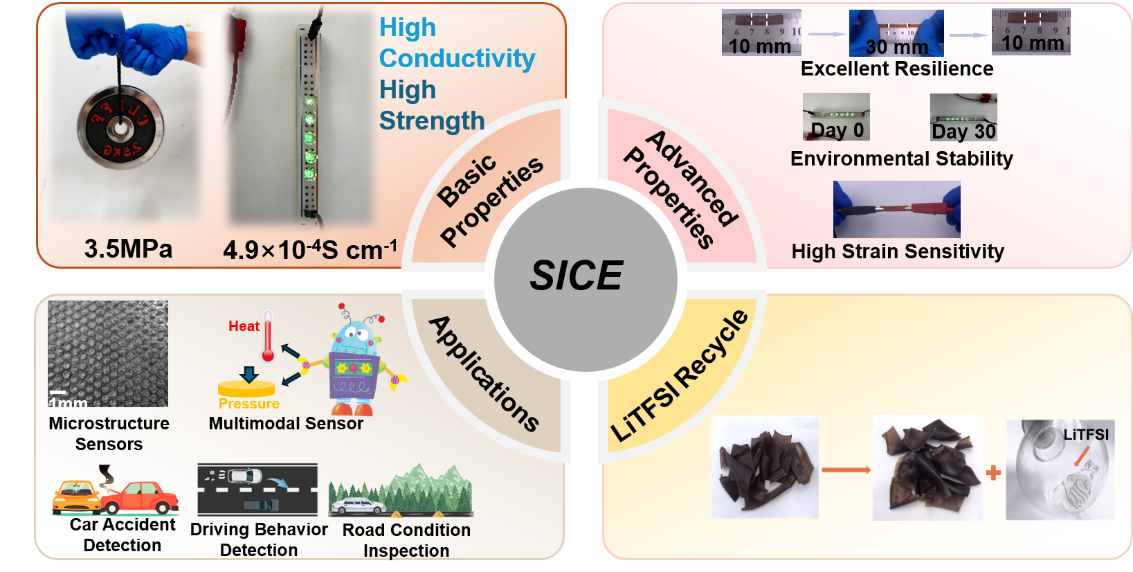 针对上述难题,该团队提出了一种制备SICE的硬相增富策略。实现固态离子导体同时具备高离子电导率和机械性能,巧妙的策略破解了固态离子导电弹性体的离子导电性和机械鲁棒性之间的冲突。采用该策略制备的固态离子导电弹性体(命名为TCICE-120),其机械强度为3.5 MPa,25°C时的导电率为4.9 × 10-4 S cm-1。此外,为了解决双(三氟甲基磺酰基)亚胺锂(LiTFSI)的高成本和环境问题,采用了一种简单高效的水循环策略来回收SICEs中的 LiTFSI,并取得了良好的回收率。