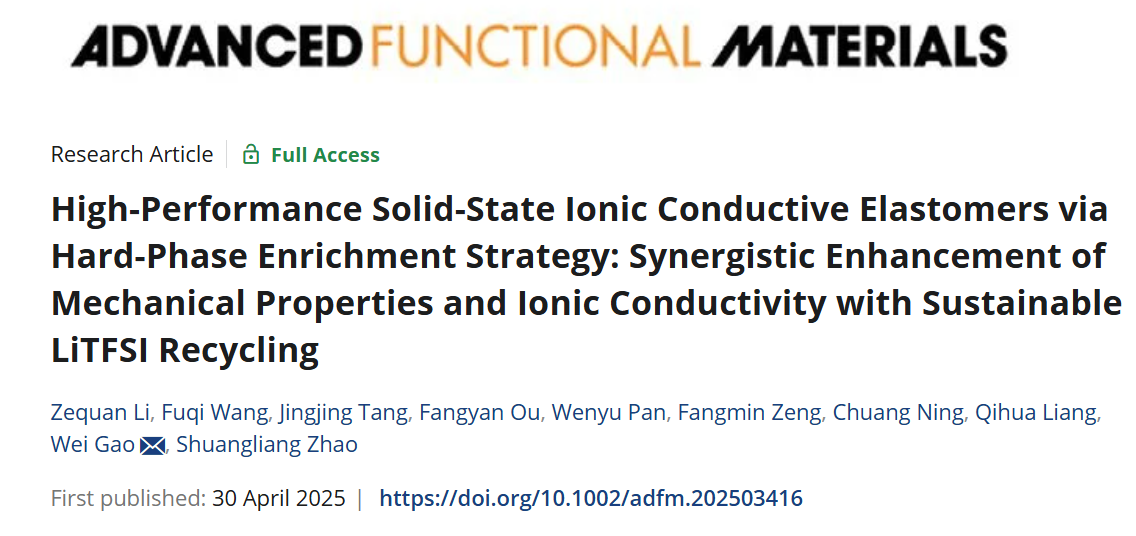 近日,太阳集团2138“高分子及结构板材”团队在固态离子导电弹性体研究方面取得新进展,研究成果以High-Performance Solid-State Ionic Conductive Elastomers via Hard-Phase Enrichment Strategy: Synergistic Enhancement of Mechanical Properties and Ionic Conductivity with Sustainable LiTFSI Recycling为题,发表在国际知名期刊Advanced Functional Materials上。文章第一作者为助理教授李泽权,通讯作者为副教授高伟,太阳集团2138是唯一通讯单位。