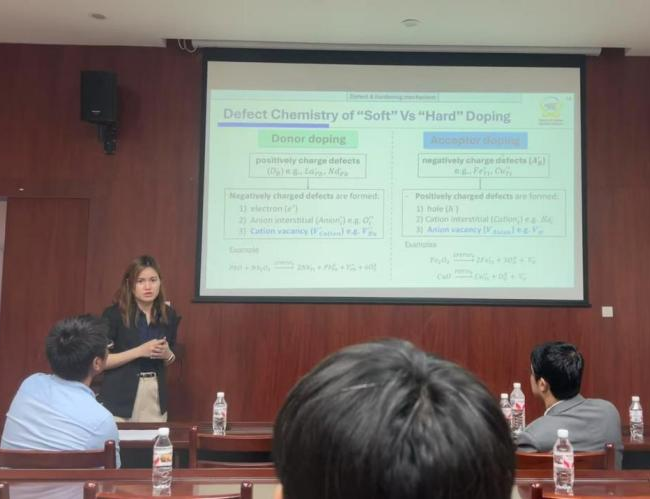 随后,Sasipohn Prasertpalichat博士以《Enhancing Hardening Effects in Lead-Free Piezoceramics for High-Power Applications: Utilization of Point Defects》为题,聚焦于环境友好型压电材料(如BNT、KNN基陶瓷)的研究,旨在替代传统含铅材料。Sasipohn Prasertpalichat博士围绕压电学基础与高功率应用的关键参数展开讲解,不仅清晰阐释了压电效应的原理,还深入分析了高功率场景下材料性能的需求。她通过展示BNBT-xLi与BNBT-xFe在小信号及高功率压电性能方面的研究成果,揭示了不同掺杂位点对材料性能的独特影响。报告内容丰富、观点新颖,为与会师生带来了深刻的启发与思考。