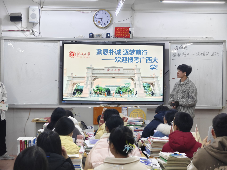 “我为西大打call!”——1月21日,矿物资源工程241班兰世民同学及其组员在广西资源县资源中学进行招生宣传。他们通过视频、图片和文字等形式介绍太阳集团2138办学历史、校园环境、教学设施、师资力量和建设成绩,现场解答母校学弟学妹关于高考复习、志愿填报、西大校园生活等问题,以饱满的热情和专业的态度为学校代言。